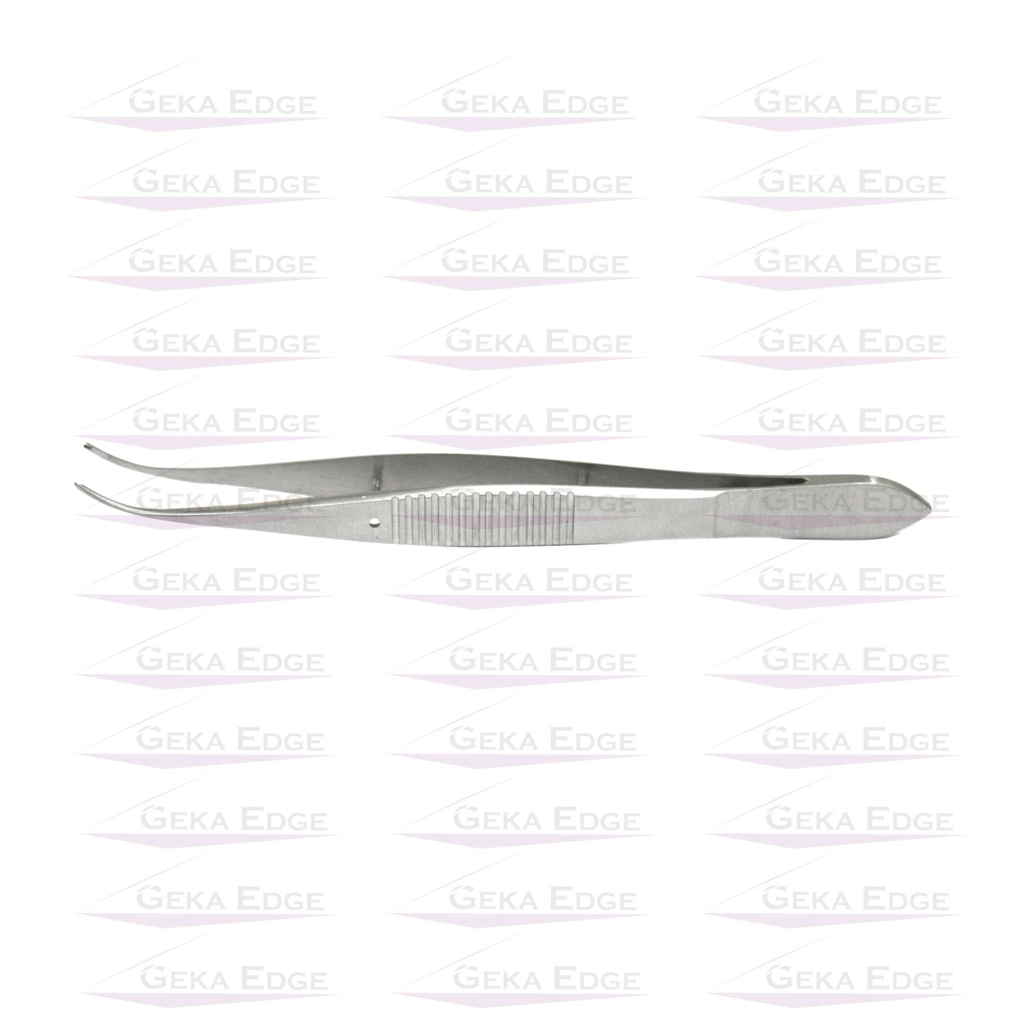The Tissue Forceps 1×2 Teeth – Curved is a curved-tip ophthalmic grasping forceps ideal for iris, conjunctiva, and scleral tissue handling during cataract or strabismus surgery.